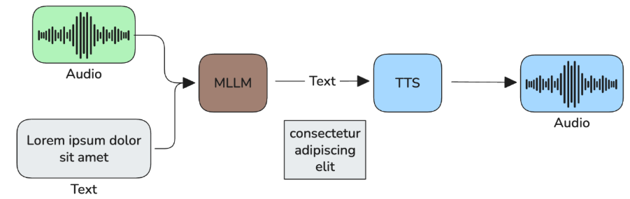 - Half-cascade pipeline: it consists of two components – a multimodal large language model (MLLM) that can consume audio directly and returns a textual response that is passed on to a TTS model.