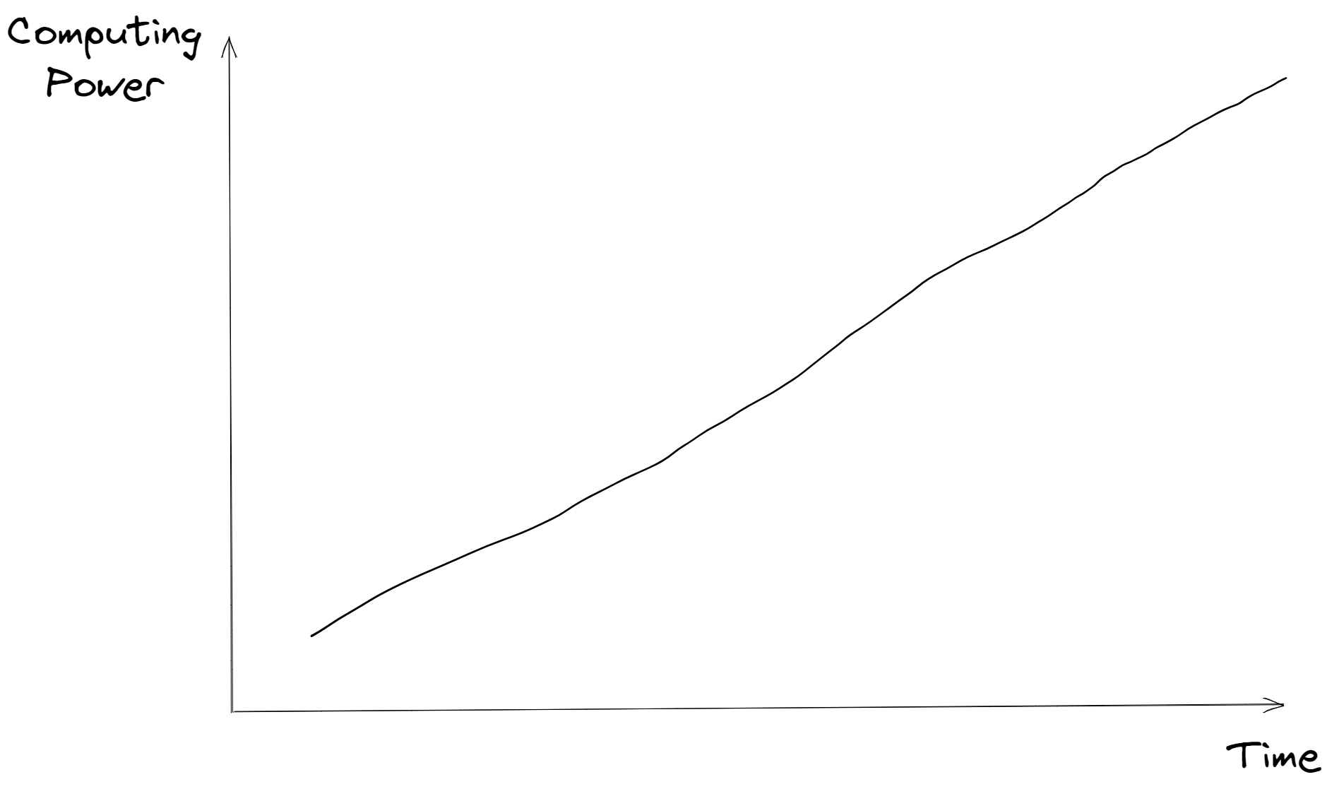 Let's start with the linear hypothesis - which states that technological evolution behaves at the same pace at every point in time. We can use the number of calculations performed per second of an artificial entity (such as a computer or processing unit) can do per second as a proxy for technological innovation. Given recent developments, it's safe to assume that more computing power also translates into more intelligent machines. This variable will be represented by the abstract "computing power" in the following plot: