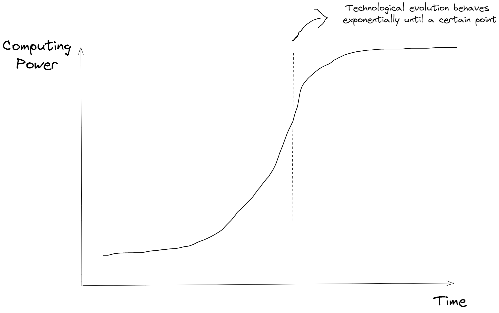 The third hypothesis (that is also unlikely) is the sigmoid growth - meaning that technological growth will behave exponentially until a certain point, hitting a cap: